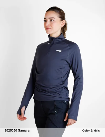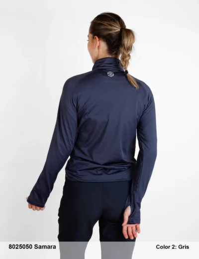 Descripció: Samarreta oberta amb mitja cremallera central invertida, protector de barbeta, costures planes amb remalladora, obertura per al polze, logotip enganxat i goma a la màniga.