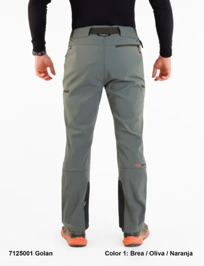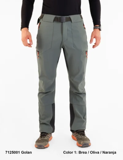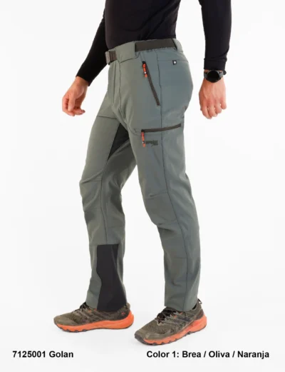 Cintura semi-elàstica amb tancament de botó amb pressió i cinturó elàstic ajustable, cinc butxaques amb cremalleres invertides, pinces al genoll, teixit especial i goma ajustable als baixos, logotip brodat.