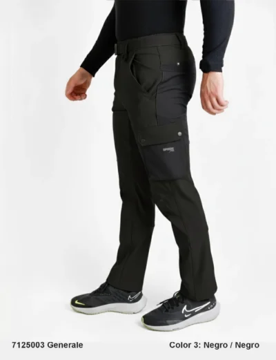 Description: Semi-elastic waistband with hook-and-button closure and adjustable elastic belt, six pockets (front pockets are French style, side cargo pockets with snap buttons, one side and one back pocket with inverted zippers), knee darts, adjustable hems, reflective trim at the back, embroidered logo.